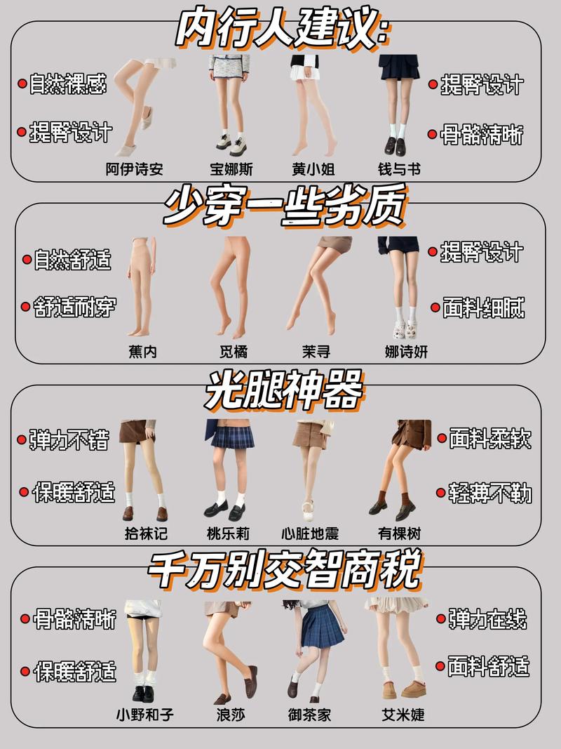 〖Five〗、茉寻光腿神器:颜色自然,穿着舒适,适合各种肤色,尤其是黄皮肤妹子。觅橘光腿神器:颜色稍微暗沉但自然,整体设计低调而优雅,适合日常穿着。范希丽光腿神器:设计独特,一袜三穿,性价比高,适合追求时尚和实用的美眉。最后,需要提醒大家的是,光腿神器想要最自然,露的越少最关键。