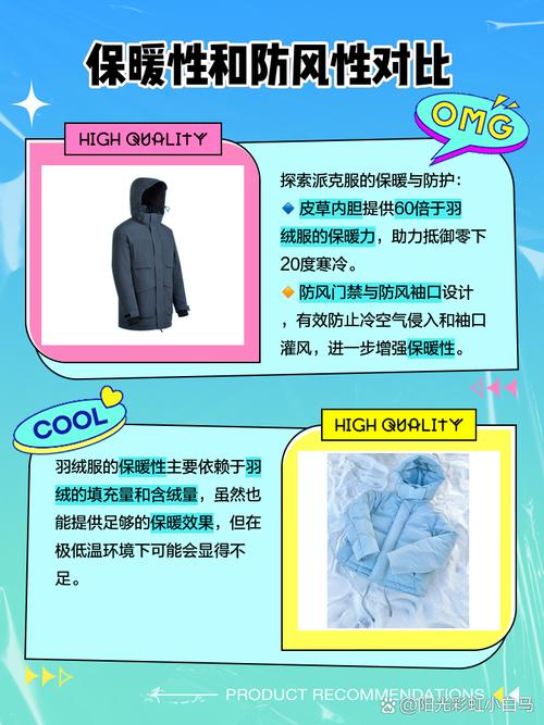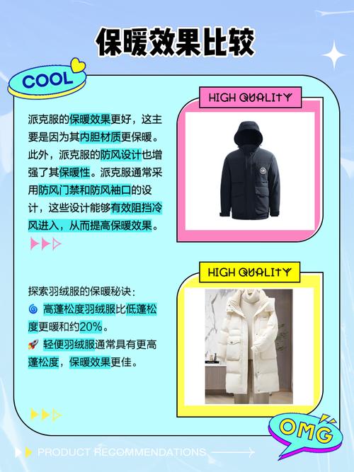 〖Four〗、综上所述,虽然派克服和羽绒服都是冬季服装的常见选取,但在保暖性能方面,羽绒服更胜一筹。在选取冬季服装时,还需结合个人需求和气候条件等因素综合考虑。无论是追求极致保暖还是时尚穿搭,羽绒服和派克服都有各自的魅力。