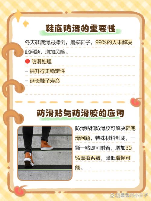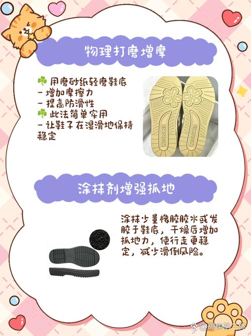 解决鞋底很滑的问题,你可以尝试以下几个小妙招哦:用土豆来帮忙!把土豆切成块儿,然后用它来擦擦鞋底。土豆里的淀粉会留在鞋底上,形成一层防滑的小薄膜,这样走路就不怕滑啦!贴上胶带!这个方法超简单,下雨天特别管用。