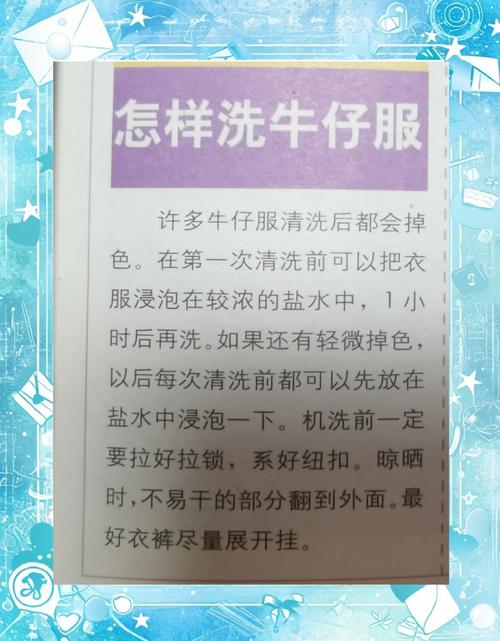 〖Two〗、防止牛仔外套掉色,可以采取以下几种方法:浓盐水浸泡法:步骤:将牛仔外套放入冷的浓盐水中浸泡约两小时,之后再使用肥皂进行常规洗涤。后续的清洗也应遵循此方法。效果:能有效防止牛仔外套掉色。凉茶水浸泡法:步骤:先用凉茶水将牛仔外套浸泡10分钟,然后按常规洗涤方法进行清洗。